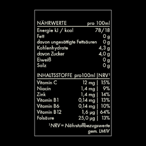 L-Tryptophan, sage extract, magnesium citrate, vitamin B complex (B1, B3, B6, B9, B12), vitamin C, zinc, yuzu juice.